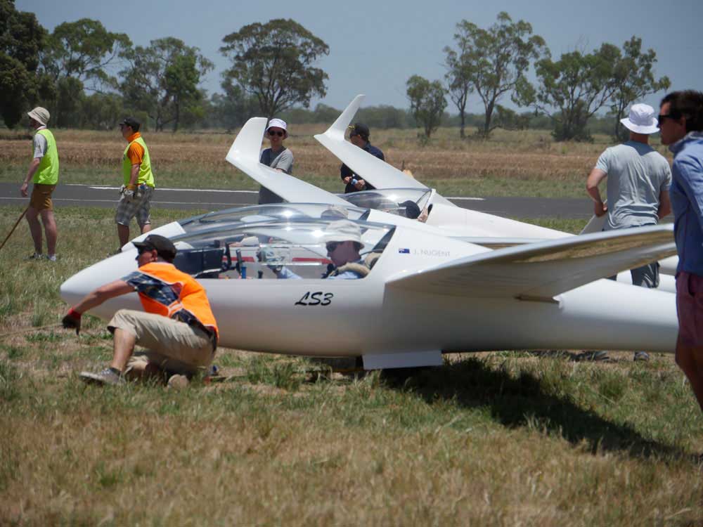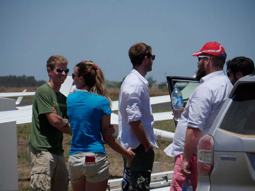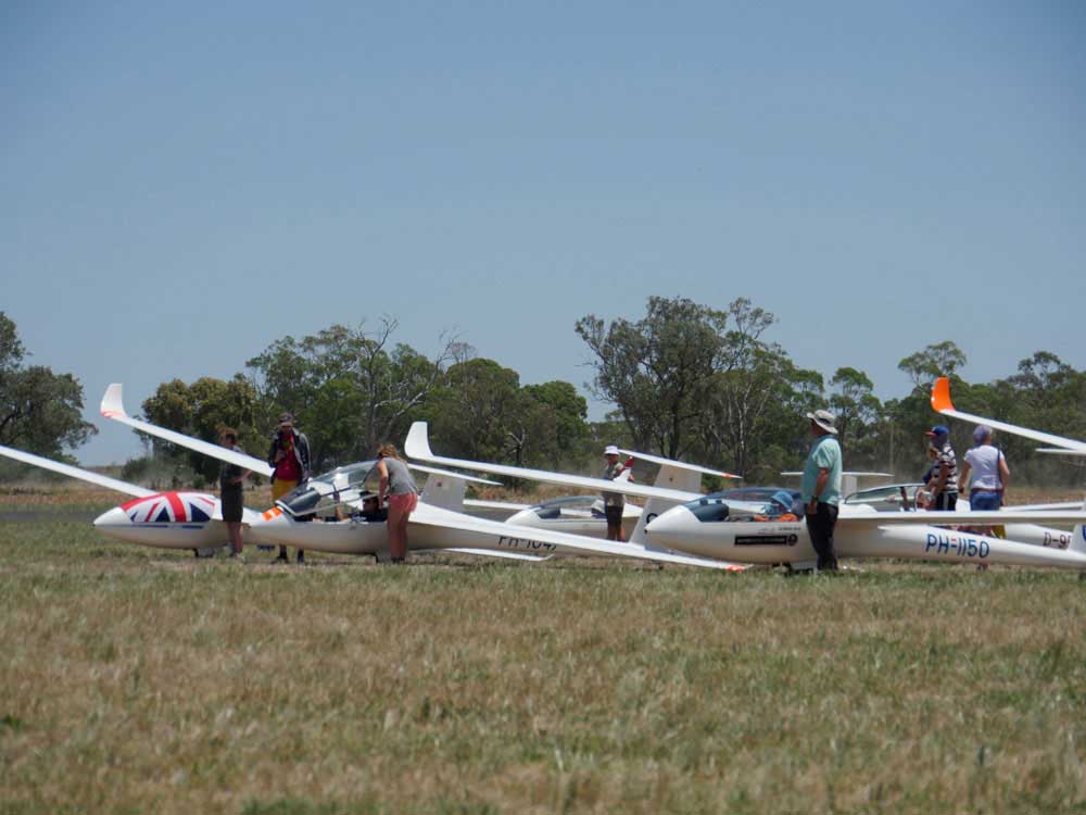 After all the pilots had landed Operations Director Terry Cubley said. 'Today we were on a different runway launching of 11 instead of 22. It is a much narrower runway but everyone coped well and we launched 59 gliders in 59 minutes. 'Initially there were a few cumulus popping. By the time the start gate opened they were about 6,000 ft above ground with cumulus to the east and the north and we thought it would be a great day. But then it blued out. I think they had a bit of cu up north. 'I watched the live tracking and saw that standard class formed two gaggles, then merged into one gaggle and preceded to fly the task together. I'm sure that the final score, other than one ore two pilots falling out the side, will reflect that. 'The speeds weren't as high as the task setters were expecting. The gliders coming in a bit later found the easterly wind was getting somewhat stronger and the thermals a bit weaker. So the final two legs were a bit more difficult. 'We had an easterly all day but the sea air tends to pulse into here and you could feel that later on in the day so the gliders that were behind found it a bit more difficult coming in on the final leg. For them the winds later were gusting 10-15 kts instead of 8-10 kts. I spoke to a couple of pilots who said they were still getting 6kt climbs on the way home so it had not slackened off too much. |