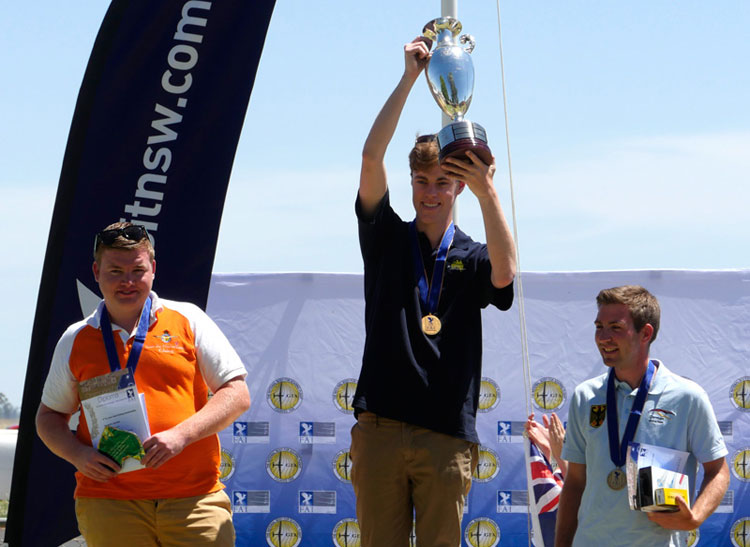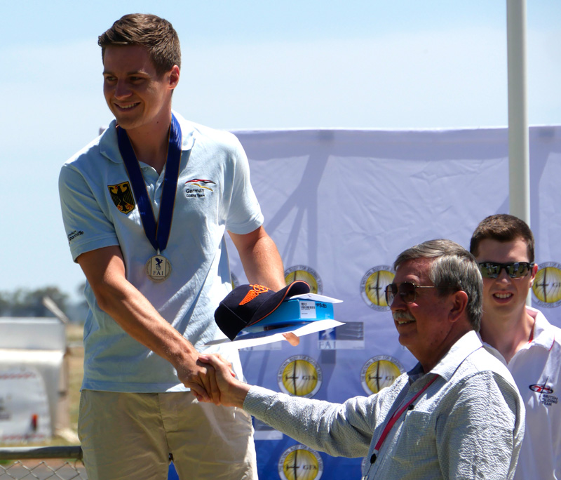 Max Stevens passing the FAI flag to Karollos Mikalauskas the team captain for